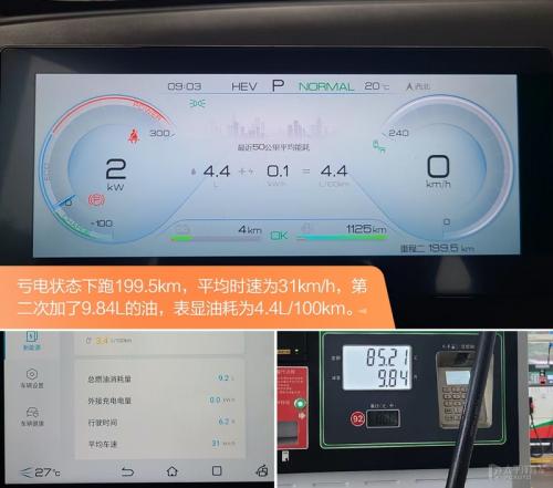 根据DM-i工作原理,在电量充足的情况下都是是以纯电使用,等到亏电时才会进入我们熟知的普通混动。在HEV混动下以普通模式进行亏电油耗测试,行驶里程为199.5km,平均时速为31km/h,这时候表显油耗为4.4L/100km,第二次加油量为9.84L,折算出实际百公里油耗为4.93L/100km。