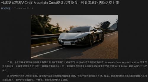 5月2日,长城华冠官方宣布,已与SPAC(特殊目的收购公司)MountainCrestAcquisitionCorp.IV签署正式合并协议,预计将于今年12月底赴纳斯达克上市。