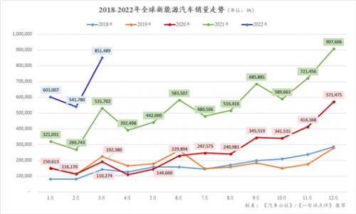 与此同时,3月全球新能源乘用车市场却收获有史以来第二高的成绩——851,489辆,虽仅略低于去年12月创下的907,606辆的最高纪录,但其在在乘用车总量的占比则与后者大致相同,都为15%左右。