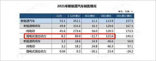 从2021年开始,插电混动汽车增长速度就开始高于纯电动汽车。乘联会数据显示,2021年,纯电动汽车累计销量为244.4万辆,同比增长168.6%;插电混动汽车销量为54.5万辆,同比增长171.2%。