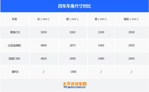 由已知的车身尺寸信息中,可以看到,海豹以及深蓝C385轴距都超过了2900mm;哪吒S目前仅公布了车身宽度,其余数据暂未公布,不过参考Eureka 03概念车( 4800/2000/1400mm ,轴距2900 mm ),哪吒S轴距也有望超过2900mm。而零跑C01车身尺寸无疑是四车最大的,也是车身长度唯一超过5米的车型。