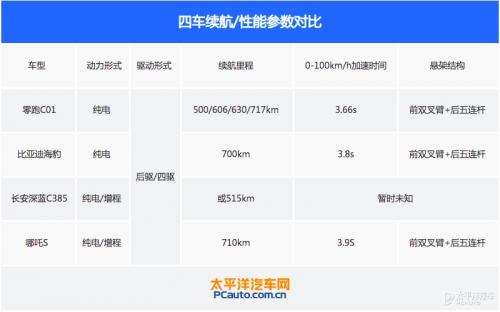 再看回竞品车型,除了深蓝C385外,其它车型续航里程均达到了700km ,并且0-100km/h加速时间也都进入3秒俱乐部。