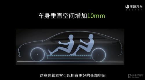 零跑CTC技术通过在车身下方设有舱室结构,舱室的上端密封,则可以取消电池上部结构,整车垂直空间增加10mm。同时省去电池侧边框与车身之前的预留间隙,增大了电池容量的布置空间。