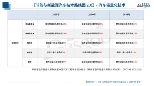就中国乘用车样本调查结果显示,乘用车重量每降低10%,油耗相应降低7.5%—9%;电动汽车车重每减轻10%,续航里程就会提升5.5%。基于此,《新能源汽车产业发展规划(2021—2035年)》、《节能与新能源汽车技术路线图2.0》中均对我国汽车轻量化提出明确发展规划要求。