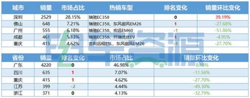 从城市来看,珠三角已然成为新能源微面最适合生长的沃土,销量TOP3城市均为广东省内城市,分别是深圳、佛山和广州。其中,深圳更是新能源微面销量TOP5城市里唯一一座环比正向增长的城市,且涨幅达到39.19%。值得一提的是,前十车型两款正增长车型的主销城市,也都是深圳。深圳的市场潜力可见一斑。