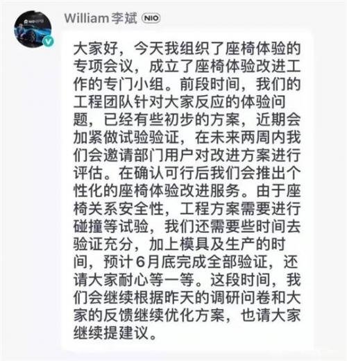 很快,随着蔚来车主的关注,原本仅是个例的座椅问题,引发了越来越大规模的用户投诉。具有类似经历的车主们,也自发形成了针对此事件的讨论群,一起发声。要求官方,尽快改进座椅的舒适度。矛盾愈发激烈,终于引发了李斌的亲自下场回复,并组织了专项会议,解决方案和时间节点也得以落实。
