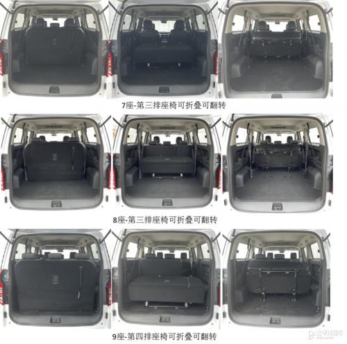车身尺寸方面,新车长宽高分别为5150/1840/1910mm,轴距为3180mm。座椅方面,新车提供了7座、8座、9座三种布局形式,同时可以通过折叠来拓展储物空间。
