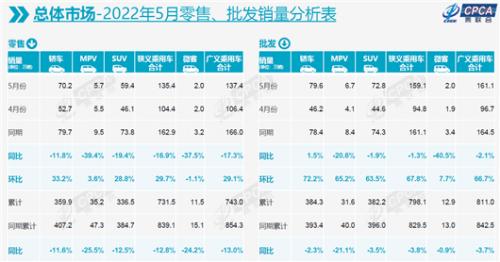 从今年前5个月的总体情况来看,得益于5月略有恢复,零售累计销量为731.5万辆,批发则达到798.1万辆,跌幅分别为12.8%和3.8%。