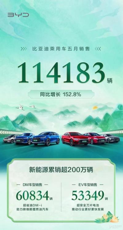 根据比亚迪官方发布的数据显示:5月份比亚迪销量再破10万辆大关,达到114183辆,同比大涨152.8%,环比增长8.25%。