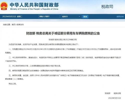 为提振汽车行业发展,5月底国家出手救市,低迷多时的汽车消费市场将迎来重大政策利好。财政部、税务总局发布了《关于减征部分乘用车车辆购置税的公告》,对购置日期为6月1日起,截止2022年12月31日期间内且单车价格(不含增值税)不超过30万元的2.0升及以下排量乘用车,减半征收车辆购置税。