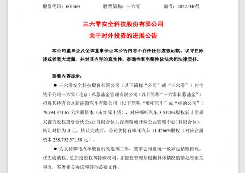 日前,三六零私募基金已与嘉兴鑫竹股权投资合伙企业(有限合伙)、深圳精诚开阔企业管理中心(有限合伙)这两家公司签署股权转让协议,将其对应持有的哪吒汽车3.5320%股权转让,转让对价为0元。