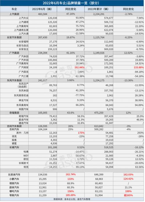 这一成绩之下,自主品牌出了不少力。中汽协数据显示,6月中国品牌乘用车共销售99.4万辆,环比增长24.5%,同比增长43.1%,占乘用车销售总量的44.8%,占有率比上年同期提升0.6个百分点。从盖世汽车此次统计中也可明显看到,自5月就率先从此前疫情影响中恢复的自主品牌,在6月继续“暴走”。