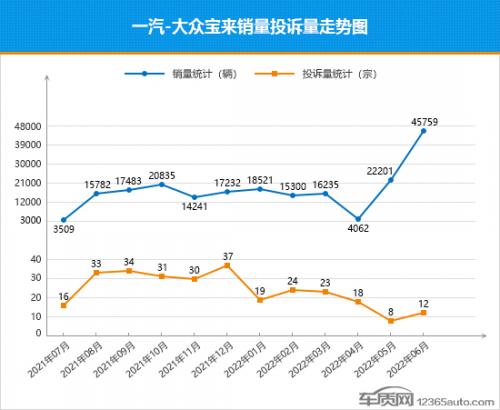 6月,一汽-大众宝来迎来中期改款,销量也随之水涨船高,首次突破4万辆,创造了新的历史纪录。从其近一年来的销量走势可以看到,大多数月份的销量都超过万辆,整体走势平稳。进入2022年后,受疫情管控等多重因素影响,宝来的销量出现短暂下滑。但随着国内疫情防控形势逐步好转,积压的市场需求得到释放,推动宝来的销量在5、6月份迎来快速回暖,将上半年的市场表现拉回了正轨。伴随着5、6月份的销量反弹,今年1-6月,宝来累计销量122,078辆,虽然与去年同期相比仍有差距,但也令其重返国内紧凑型车销量排行榜前三名。与销量冲高形成鲜明对比的是,宝来的月投诉量近半年来呈现逐月降低的趋势,短期口碑表现稳定。未来,在中期改款车型带来的红利刺激下,宝来未来的市场表现将有望逐步企稳。