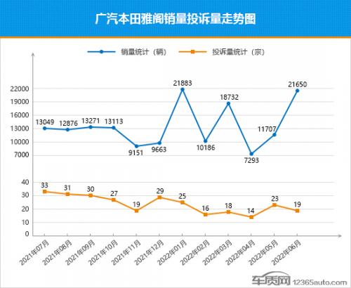 在经历了销量“两连涨”后,雅阁的月销量再次突破2万辆,达到近一年来的第二高位。回顾其近一年来的销量表现,大多数月份的销量均保持在万辆之上,但在进入2022年后,销量波动变得更加频繁,市场表现难以企稳。2022年已过半,作为广汽本田当家花旦,雅阁的整体表现还是要好于去年同期的,前6月累计销量达95,506辆,与去年同期相比提高了7.1%,在国内中型车市场销量榜单中稳居前三甲。与销量走势不同,雅阁的月投诉量在经历2021年上半年的持续高企后,近一年来走势稳中有降,口碑表现值得肯定。短期来看,雅阁的市场走势或将延续上半年的波动,在震荡中企稳走高。