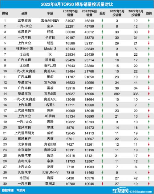 在6月份的质量问题中,“影音系统故障”投诉量突破300宗,稳居故障排名第一位,投诉量环比上涨10.4%。“仪表台开裂”问题本月投诉量环比出现明显增长,较5月份上涨44.6%,排名上升至第二位。在服务问题中,“不按约交车”投诉持续高企,投诉量较5月份上涨52.2%,投诉增量主要来自于部分自主品牌新能源车型。此外,“无零配件”投诉量突破百宗,环比上涨66.7%,排名上升至第三位。去除投诉人自愿申请撤诉的信息后,2022年6月TOP30轿车销量投诉量排名如下: