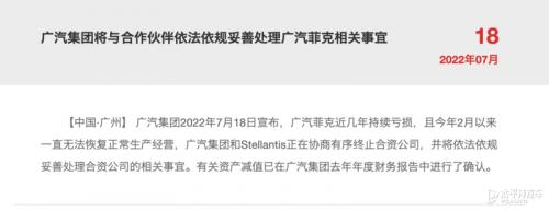 广汽集团也跟进宣布,广汽菲克近几年持续亏损,且今年2月以来一直无法恢复正常生产经营,广汽集团和Stellantis正在协商有序终止合资公司,并将依法依规妥善处理合资公司的相关事宜。有关资产减值已在广汽集团去年年度财务报告中进行了确认。
