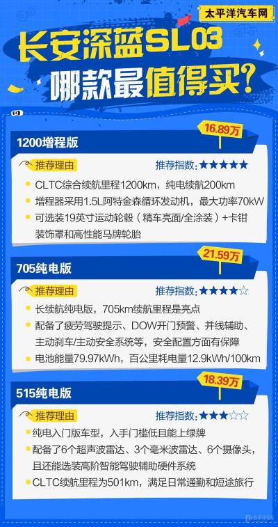 1200增程版作为长安深蓝SL03的入门版,用“入门即高配”来形容一点也不夸张。配置十分全面,除了纯电续航和动力等方面和其他版本车型有区别外,其余配置基本一致。参考其1200km的CLTC综合续航里程,远程旅途也不是问题。若你预算有限且有里程焦虑的话,1200增程版绝对是你最最实惠的选择。