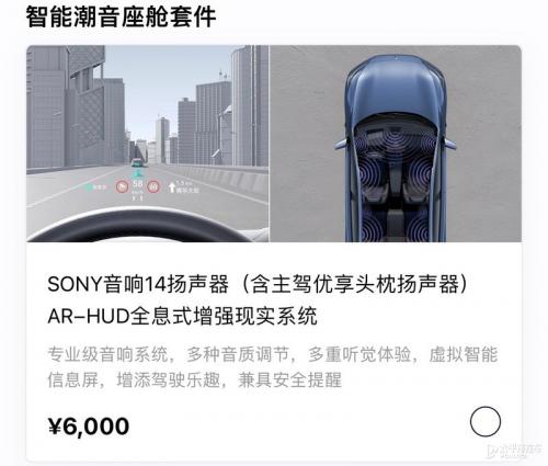 另外,入门版车型还能加6000元选择智能潮音座舱套件,包括了SONY音响14扬声器和AR-HUD抬头显示功能。