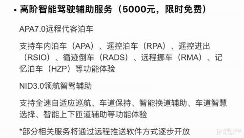另外,高阶辅助驾驶限时优惠价格为20000元,包括NID3.0和APA7.0系统仅适用于纯电版车型。值得注意的是,纯电版准车主若选装2万的高阶智能驾驶辅助后,交车时间也会从2022年10月延后到2023年4月。