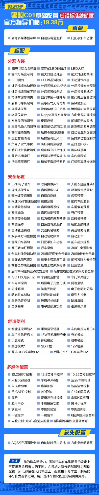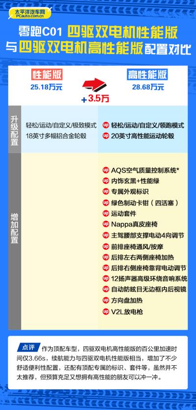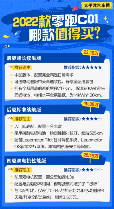 车系的高配车型均搭载了前后双电机,电动四驱的性能毋庸置疑,以四驱双电机性能版为例,百公里加速直接来到了4.3s,比后驱长超续航版快了将近一倍。选择前后双电机版本的朋友一般都有明确的需求,因此并不需要过多的推荐,在此小编要补充的是,零跑C01的四驱双电机性能版虽然有较好的性能,但它也没有忽略巡航能力,该版本依旧保持了630km(CLTC工况)的水平。