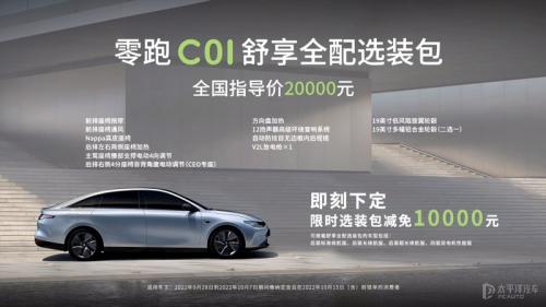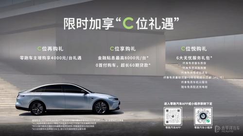 在发布会上,零跑汽车还推出了增购、贴息等多项礼遇政策。此外,官方还推出了舒享全配选装包,选装包官方指导价为2万元,即可下定可享受官方限时选装包减免1万元的优惠政策。