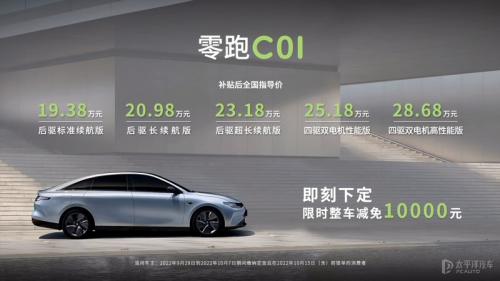 【太平洋汽车导购频道】作为造车新势力,零跑品牌的知名度并不如“特魏小理”等车企,但这并不妨碍它默默耕耘,从多少带点乡土气息的零跑S01到颇有都市现代风格的零跑C11,零跑汽车在品牌形象上有了很大的提升。9月末,零跑汽车又带来一款全新车型——零跑C01(询底价|查参配),新车定位中大型纯电动轿车,共有5款车型可选,售价区间为19.38-28.68万元。至于哪款车型性价比最高?它们都有哪些差异?本文将会进行详细分析、对比。