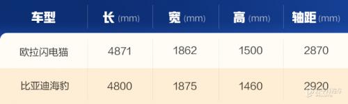 车身尺寸方面,闪电猫长宽/分别为4871/1862/1500mm,轴距为2870mm。海豹的车身长宽高分别为4800/1875/1460mm,轴距达到2920mm。单看账面尺寸,两车各有优势。