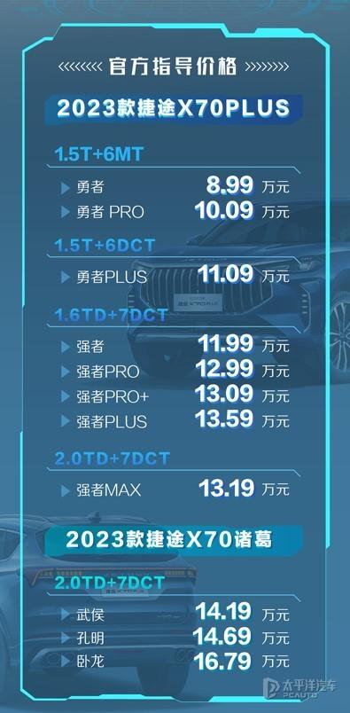 【太平洋汽车新车频道】11月16日,捷途官方宣布2023款捷途X70 PLUS(询底价|查参配)&捷途X70诸葛正式上市,2023款捷途X70 PLUS共推出8款车型,售价8.99 -13.59万元,2023款捷途X70诸葛推出3款车型,售价14.19 -16.79万元。