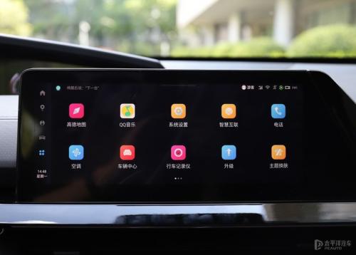 中控液晶触摸屏的尺寸也是10.3英寸,采用悬浮式布置,并且向驾驶员侧稍微倾斜了一定角度,方便驾驶员查看和操作。屏幕很高清,操作时也相当灵敏快捷,功能方面更是走在前列,提供了高德地图、QQ音乐、唱吧、智能家居、主题换肤等诸多功能,还可以在应用商店和小程序里面体验更多功能,基本上了车就不需要玩手机了。