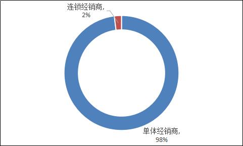 二手车交易市场又是由众多的二手车单体公司和连锁经销商组成,这些个体分别从事了二手车的经销、拍卖、经纪、鉴定评估等工作。单体的公司主要有个体经营者和合资成立两种,连锁经销商指的是品牌连锁经营的运营主体。目前,这两者在二手车交易市场中的分布如下: