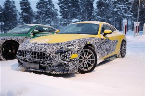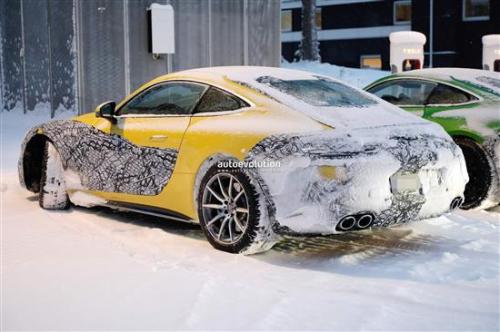 车尾方面,由于伪装贴纸和积雪的阻碍,并不能看出更多尾灯及后包围设计细节,不过圆形的双边共四出的排气管布局,还是可以看出一些眉目,说明此台黄色的测试车并不是马力最强劲的新一代AMG GT车型。