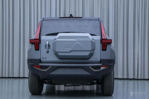 车身侧面整体轮廓采用了类似奔驰G级、路虎卫士等硬汉形象的越野车风格,轮廓棱角分明。细节方面,新车配备了隐藏式门把手,在轮拱后方配备了动态模糊状的装饰点缀,侧后视摄像头隐藏在轮拱装饰之中,D柱横向饰条上内嵌有发光灯带。新车长度达到了5300mm,轴距为3050mm,配备了尺寸为275/60 R20的轮胎。