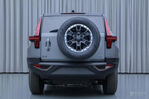 猛士917的车侧线条平直硬朗,轮眉部分很粗壮。车尾部分,后风挡与后尾门接近垂直角度,与整车硬朗的设计相契合,尾灯等细节目前仍采用临时组件。新车整车体型相当巨大,离地间隙非常高,并配备有裸露的外挂备胎,有着很大的接近角、离去角,保证车辆的通过性。新车长宽高分别为4987/2080/1935mm,轴距为2950mm。