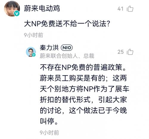 当有车主问到免费赠送大NP的问题时,秦力洪表示,不存在NP免费的普遍政策,蔚来员工购买是有的。同时他表示,个别地方将NP作为展车折扣的做法已于当晚叫停。