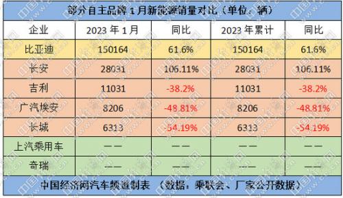 数据显示,1月,比亚迪乘用车、长安乘用车、吉利、奇瑞、长城的销量分别为150164辆、124664辆、103452辆、74246辆、61519辆,同比分别增长57.8%、-21.41%、-6%、10%、-44.96%。此外,在去年展现向上突围之势的上汽乘用车和广汽自主,在1月的销量分别为55698辆、31483辆,同比分别下滑17.56%、40.14%。