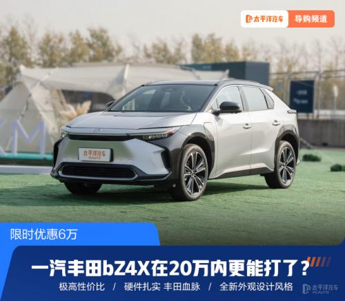 【太平洋汽车新车频道】优惠足足6万元?到底是什么车的优惠幅度如此之大?最近我们得到消息,一汽丰田bZ4X现在有一波限时优惠6万元的活动,也就是说bZ4X的两驱版本车型售价将全部低于20万元,入门车型售价更是来到了13.98万元,这对于国产电动车市场无疑是一次巨大的冲击。
