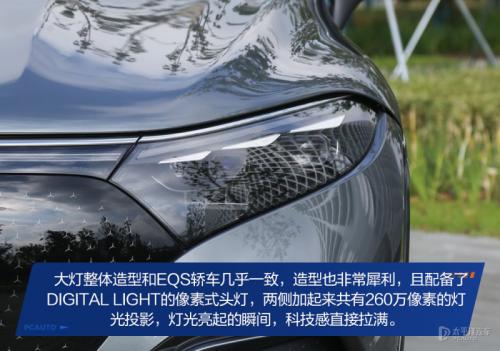 据悉,全新EQS纯电SUV的头灯含金量极高,它搭载了多光束LED数字照明系统,在每个灯组内都集成了三个LED模块,而每个模块都由130万个微镜折射,综合照明分辨率达到260万像素,可与S级一样利用头灯将警告符号、标记辅助等信息投射在前方道路上。