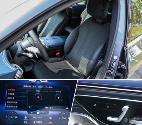 细节来看,座椅面还加入了不少刻线和打孔设计,前排座椅支持加热以及通风,也可以选装热石按摩功能,头枕支持四向调节,可以有效地支撑头部,更符合驾驶时的人体工学。