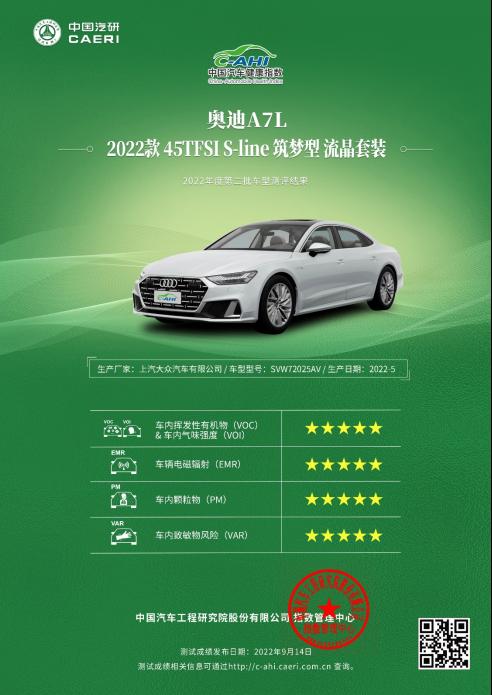 在“健康中国2030”的国家战略大背景下,健康汽车联合研究中心联合中国汽车健康指数(C-AHI)推出“五星健康车”认证标识,以应对中国汽车消费市场们对车内环境品质提出的更高的要求。在中国汽车健康指数(C-AHI)2022年第二批次车型的测评结果中,上汽奥迪A7L在各测评板块均获得五星成绩,为消费者购车提供重要参考。