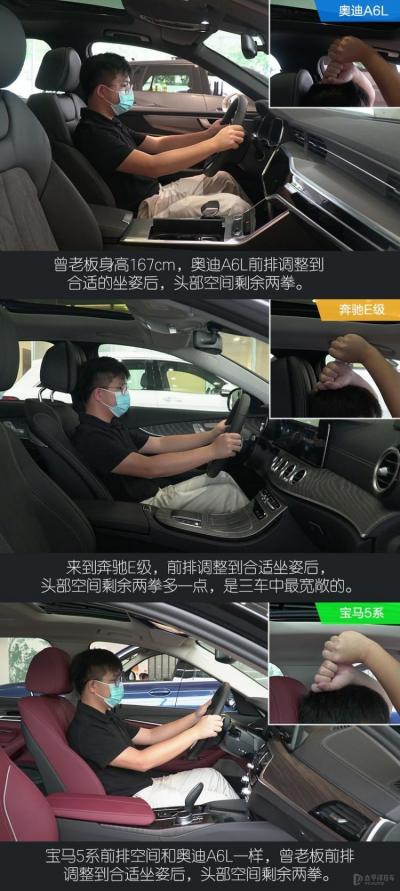 167CM的曾老板前排调整到合适的坐姿后,三车头部空间均有两拳剩余。相比较,奔驰E级头部空间剩余两拳多点,比其余两款竞品车型,头部空间方面会更宽敞。