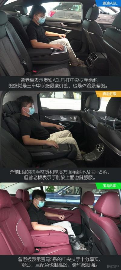后排中央扶手方面,曾老板表示宝马5系的中央扶手十分厚实,舒适,且配色也很高级、豪华感很强;紧接着就是奔驰E级的扶手,虽然不及宝马5系,但手肘放上面也挺舒服的;而奥迪A6L给曾老板的感觉是三车中手感最廉价的,体验最差。
