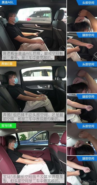 前排保持不变,167CM的曾老板坐到后排,三车腿部空间均有两拳多剩余。奥迪A6L是三车中腿部空间最宽敞的,足足剩余了三拳多点;后排头部空间方面,虽然三车都有两拳剩余,但宝马5系相比其余两款车型稍占优势,有两拳多的剩余。