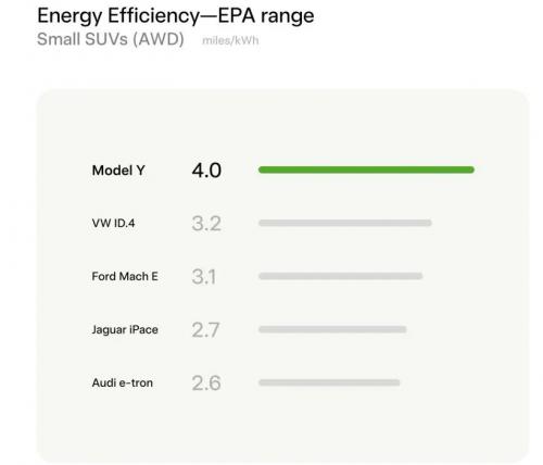 此外公布的数据看,特斯拉Model Y四驱版每度电可行驶4英里,比大众ID.4、福特电马能耗表现也都好。