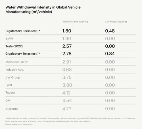 而目前生产制造环节,单车用水量最少的竟然是宝马,为1.9立方每车。特斯拉2022年平均用水量为2.57立方每车。