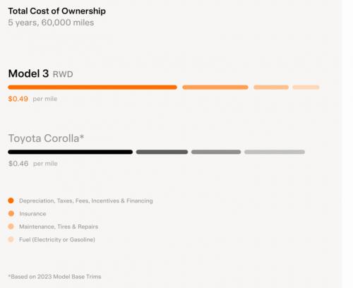 特斯拉认为虽然Model 3标价与宝马、奥迪同级别产品相差不大(北美市场),但由于电动车维护成本低、充电便宜以及二手特斯拉残值率也高,所以综合使用成本远低于同价位燃油车。