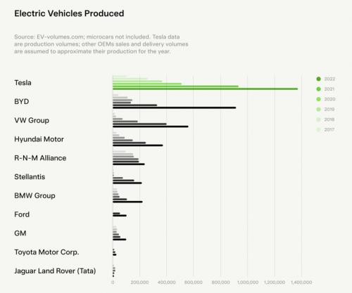 不过,特斯拉这份表单是把自己的产量和其他车企的交付量进行了一个对比,从图表上可以看到特斯拉的产能从2018年之后每年的增长速度非常快。