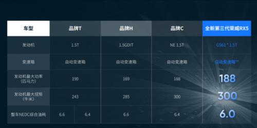 上汽蓝芯动力GS61 1.5T发动机采用了全新一代SGCS燃烧系统,配合350bar高压燃油喷射系统等技术的应用,全新第三代荣威RX5油耗仅为6.0L/100km(NEDC)。GS61采用了电控可变喷嘴涡轮增压技术(VGT),并且经过发动机调校优化,实现高速上的持续功率输出。