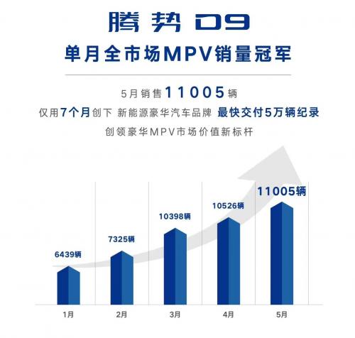 例如比亚迪旗下的腾势,5月销量达11,005辆,累计销售55,496辆。自去年10月交付以来,腾势D9月销量持续上涨,截止5月已连续三个月月销破万。且据腾势透露,腾势D9成交单价突破42万元。截至目前,腾势D9热销大定订单已突破80000。