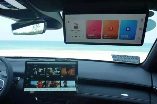进入车内,深蓝S7营造出了更加简洁的座舱空间。相比于深蓝SL03,新车取消了液晶仪表,取而代之的是一块大尺寸的AR-HUD。15.6英寸的“向日葵”中控屏内,集成了时速、档位、转向灯行车信息。值得一提的是,深蓝S7在常规的副驾遮光板位置,还安装了一块可折叠的12.3英寸超感智慧屏,并可实现三屏联动分享等功能。
