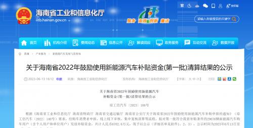 6月14日消息,海南省工信厅于近日发布了《关于海南省2022年鼓励使用新能源汽车补贴资金(第一批)清算结果的公示》(以下简称“《公示》”),拟对第一批符合我省补贴条件的29676辆新能源汽车购车用户(含个人用户和单位用户)发放补贴资金,共计人民币6702.6万元。